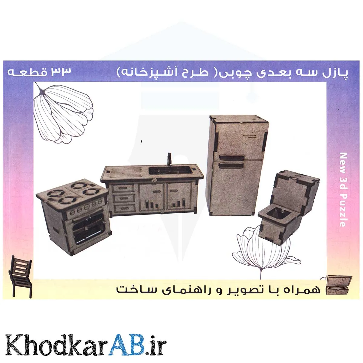پازل چوبی سه بعدی آشپزخانه کالایی مناسب برای سرگرمی و شکوفا شدن استعداد فرزندتان است. این پازل ها قابلیت رنگ آمیزی با گواش، رنگ اکرلیک و حتی مداد رنگی را دارند. کودک دلبندتان میتواند قطعات مختلف را به دلخواه و سلیقه خود رنگ آمیزی کند و یک پازل منحصر به فرد داشته باشد. به علاوه نقشه راهنمای ساخت این پازل ها و ترتیب اتصال قطعات به هم، با شماره گذاری در نقشه ساخت مشخص شده. پس سرهم کردن این پازل را بیش از پیش آسان کرده است.