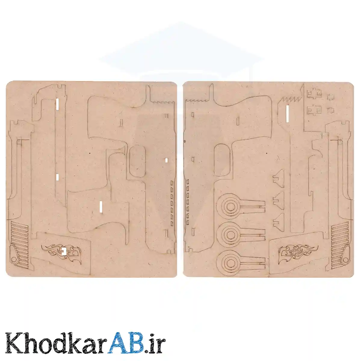 پازل کلت کشی با اینکه ۱۷ قطعه داره، اما به دلیل نوع چیدمان قطعات، ۲ ورقی هست و روی ۲ ورق چوبی ارسال میشه. بدنه کلت شما پس از ساخت قابل رنگ آمیزی هست و میتونید با مداد رنگی، رنگ اکرلیک، آبرنگ و… کلت موردعلاقه خودتون رو طراحی کنید. پازل چوبی ۳ بعدی کلت کشی کاملا ایمن طراحی شده؛ بااینحال بعد از ساخت تفنگ به هیچ عنوان کش را به سمت افراد یا حیوونها پرتاب نکنید.